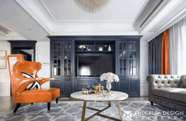 ? 空間的色彩方面我們以富于變幻的高級灰作為基調,素雅的色彩承載了優(yōu)雅穩重的藏藍色家具,搭配靈動(dòng)又熱情的愛(ài)馬仕橙皮面沙發(fā),使整個(gè)空間既清雅貴氣,又多了一份生氣和活力。